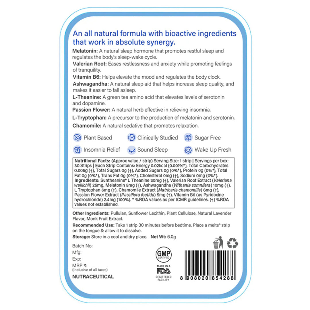 When choosing a sleep supplement, it's important to look for key ingredients known to promote relaxation and improve sleep quality. Melatonin is one of the most common and effective natural sleep aids, helping regulate the body’s sleep-wake cycle. Herbal ingredients like valerian root, chamomile, and lavender have long been recognized for their calming properties and can support a restful night’s sleep. L-Theanine, an amino acid found in tea, is another excellent addition, known for its ability to reduce stress and improve sleep quality. The formulation should also be gentle on the stomach, free from unnecessary additives, and have minimal side effects. For faster absorption, opt for supplements with advanced delivery technology, such as oral thin strips that bypass the digestive system. This ensures that the active ingredients enter the bloodstream quickly for maximum efficacy. Additionally, natural sleep supplements should be non-habit-forming and provide a clean, sustainable option for improving sleep quality. With the right ingredients and technology, these supplements can significantly improve both the quality and duration of sleep, supporting better mood, stress reduction, and overall well-being.