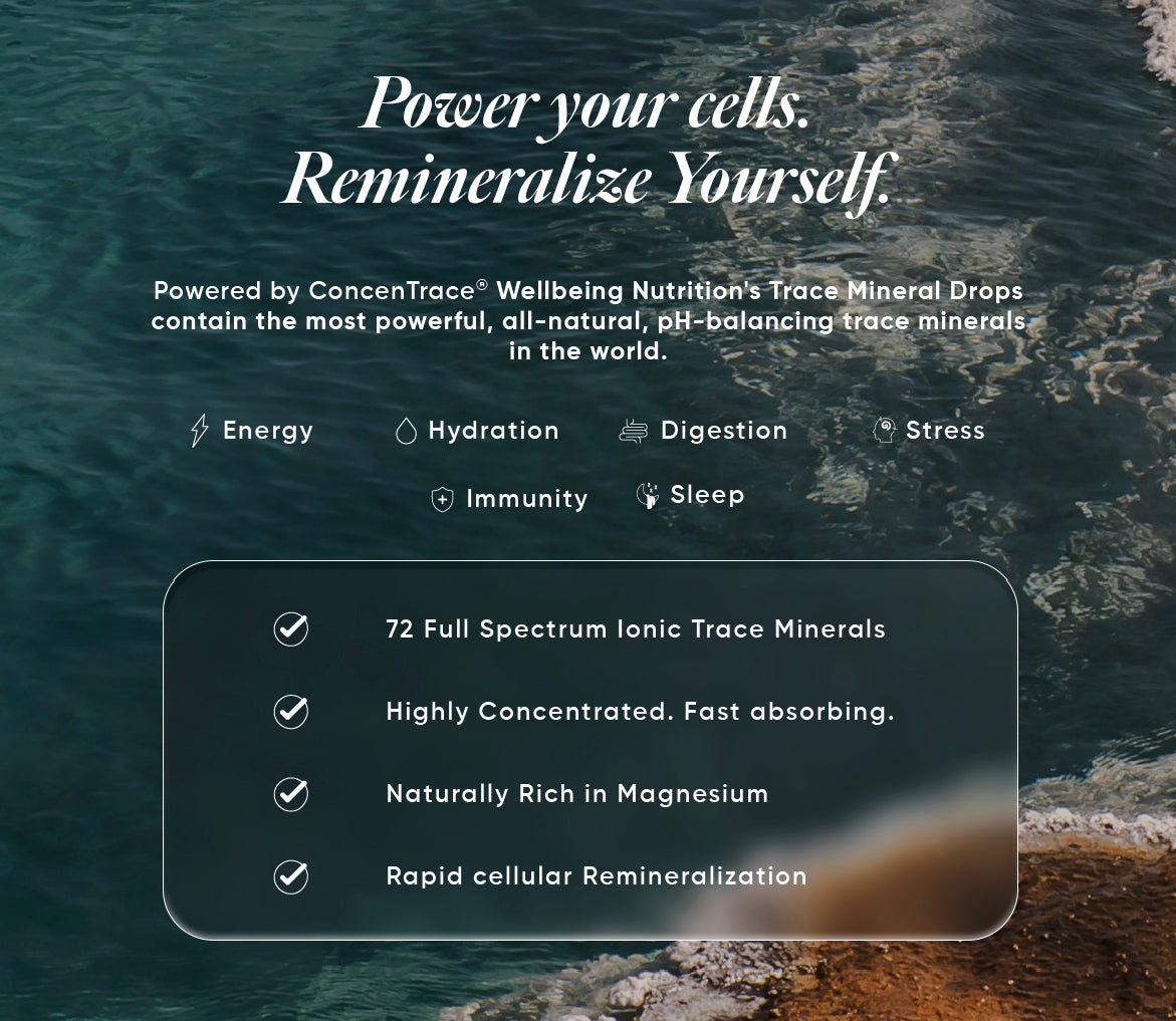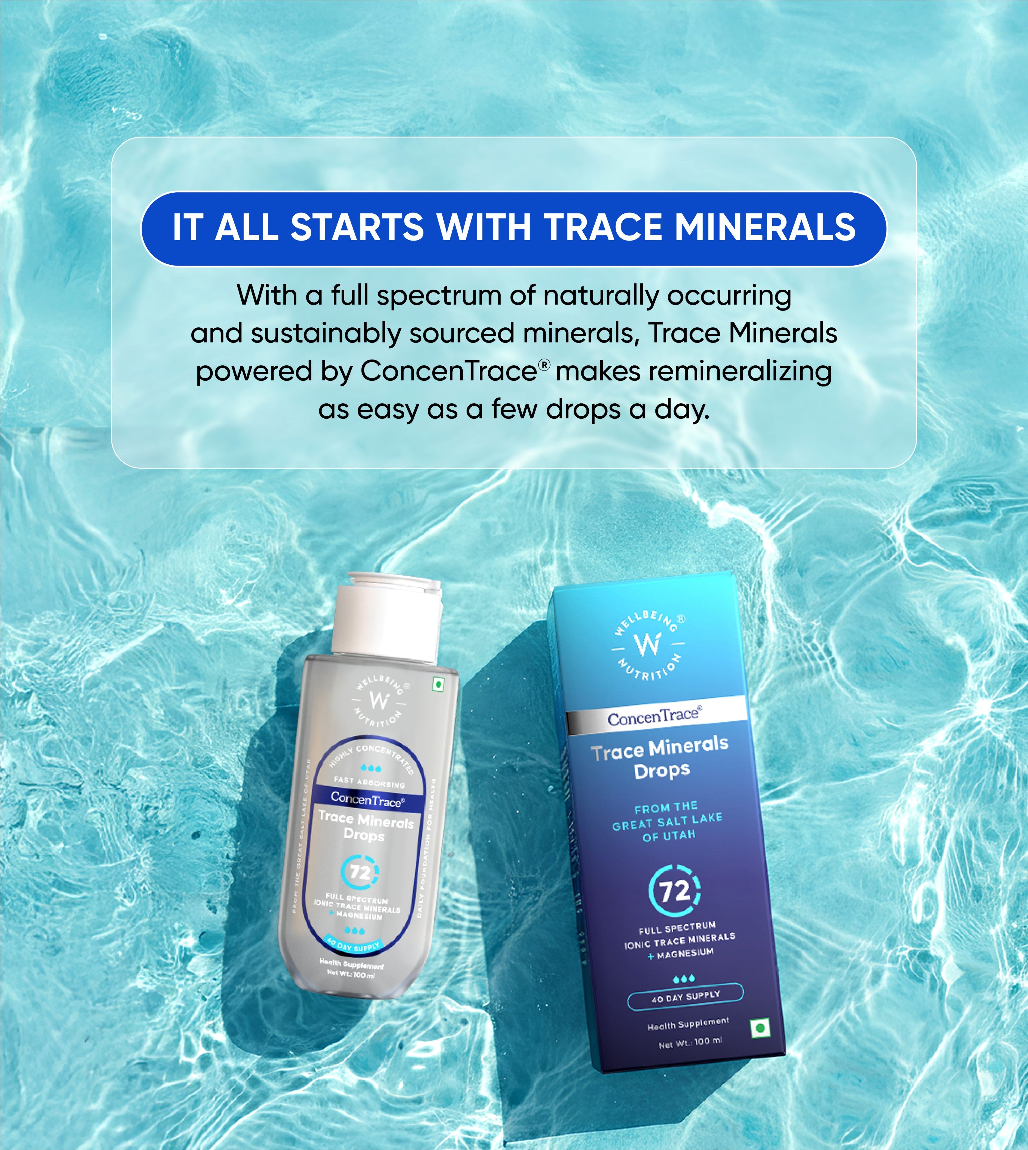 India’s first Trace Mineral Drops powered by ConcenTrace®, a clinically proven complex of 72 full-spectrum ionic trace elements sustainably harvested from the pristine Great Salt Lake of Utah using ConcenFlo®, a proprietary technology that ensures exceptional purity and potency. This highly concentrated liquid mineral complex helps restore the body’s natural mineral balance, supporting over 300 metabolic processes and cellular hydration for optimal health and vitality. Enriched with bioavailable magnesium, it replenishes essential minerals missing from soil and diet, helping maintain energy, immunity, and pH balance naturally one drop at a time.
